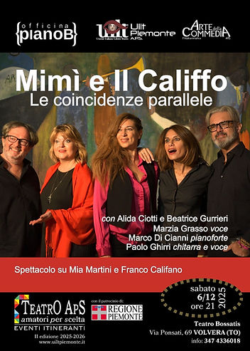 “Mimi e il Califfo, le coincidenze parallele” eÌ€ un ritratto teatrale a piuÌ€ voci dedicato a due degli artisti piuÌ€ amati della canzone italiana; un delicato intreccio che prende ispirazione da alcuni momenti, intimi e pubblici, di due personaggi davvero straordinari come Mia Martini e Franco Califano. Con le attrici Alida Ciotti e Beatrice Gurrieri che interpretano e talvolta ricostruiscono, alcuni momenti salienti della vita e della carriera di MimiÌ€ e del Califfo, in un morbido e continuo passaggio di ruoli ideale per far emergere le coincidenze parallele che accomunano i due personaggi